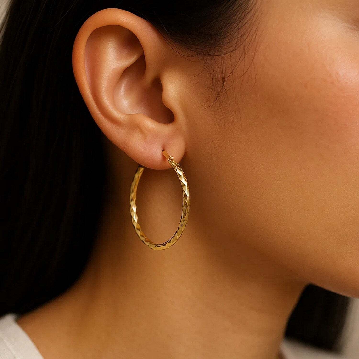For a standout look, our diamond-cut slender hoops are the firstword in jewelry fashion. Sleek with sparkle, these mid-size hoopearrings are a definite must-have. Snap-lock closures keep themsecure. 2.0 millimeters width.
