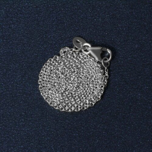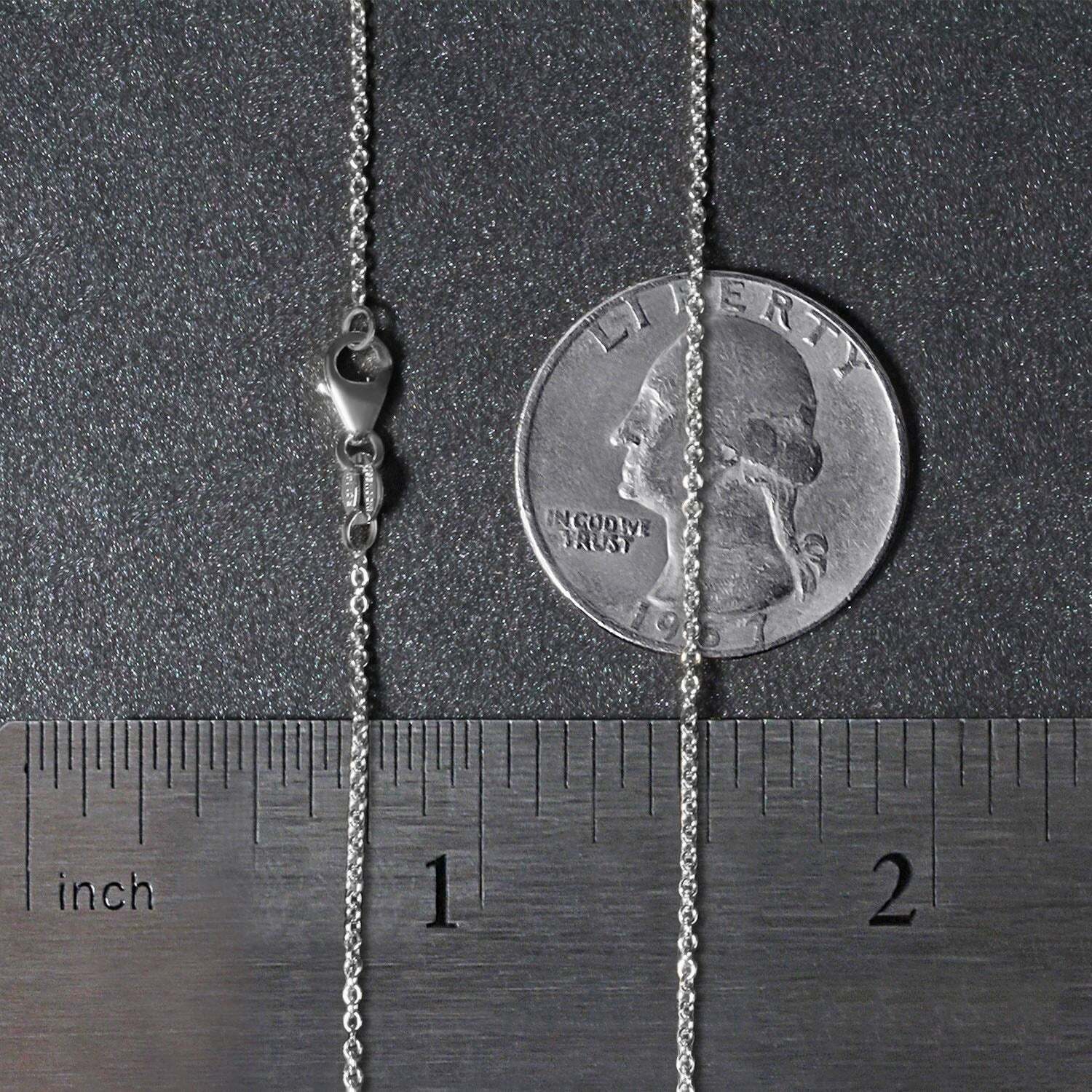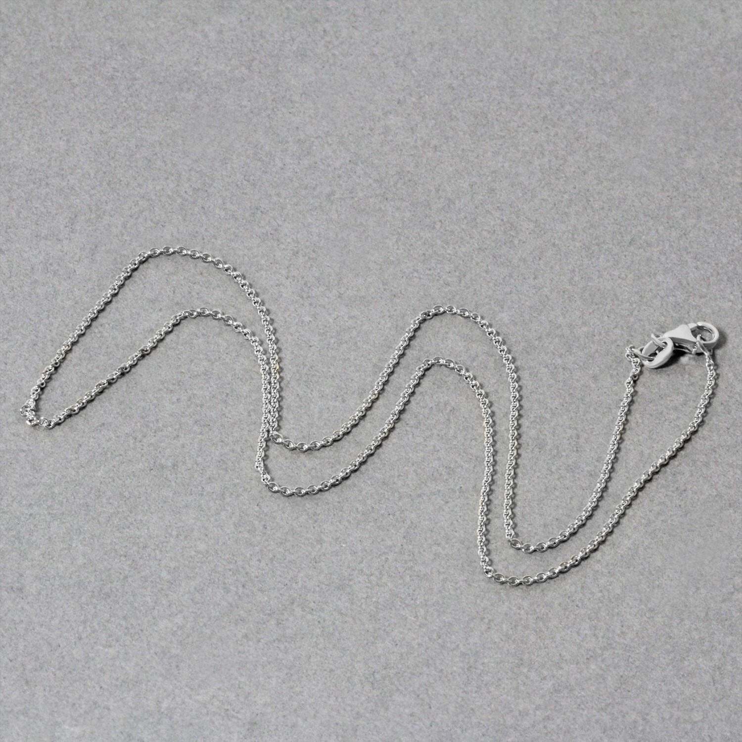 This round cable link chain comes in 14k white gold and has awidth of 1.2 millimeters.