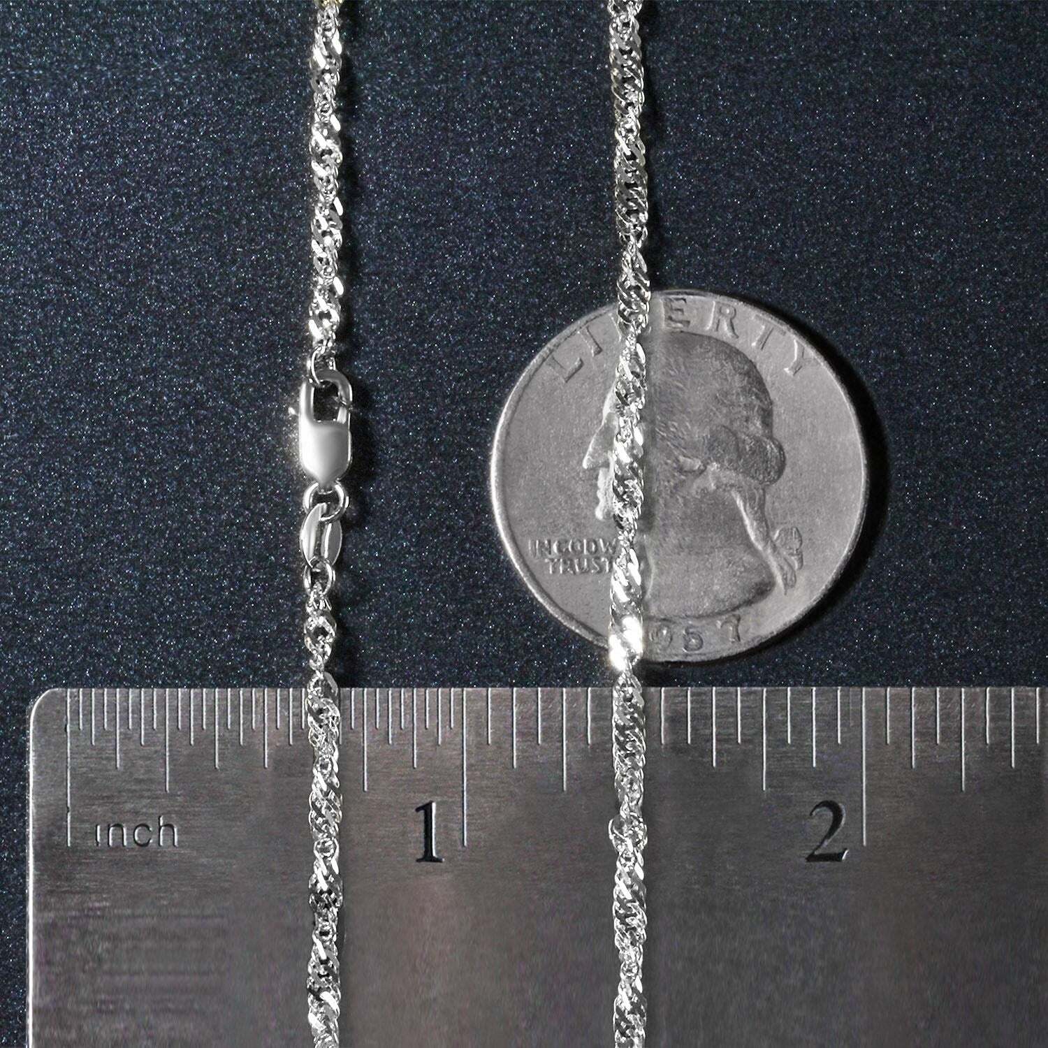 This Singapore chain comes in 14k white gold and has a width of2.10 millimeters.