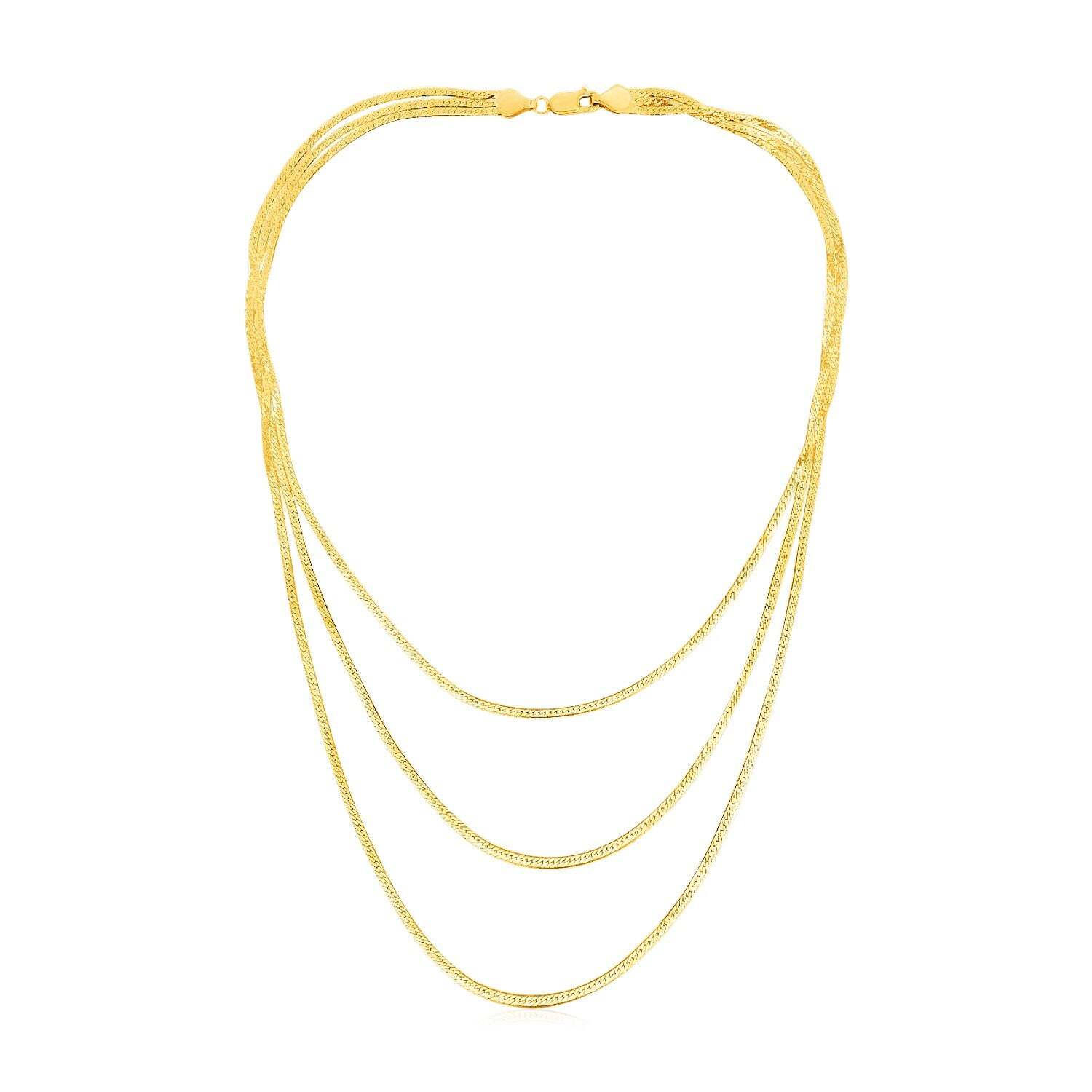 Three classic herringbone chains of 14k yellow gold are joinedbeautifully into one timeless and versatile necklace. Shortestchain is 16 inches long.