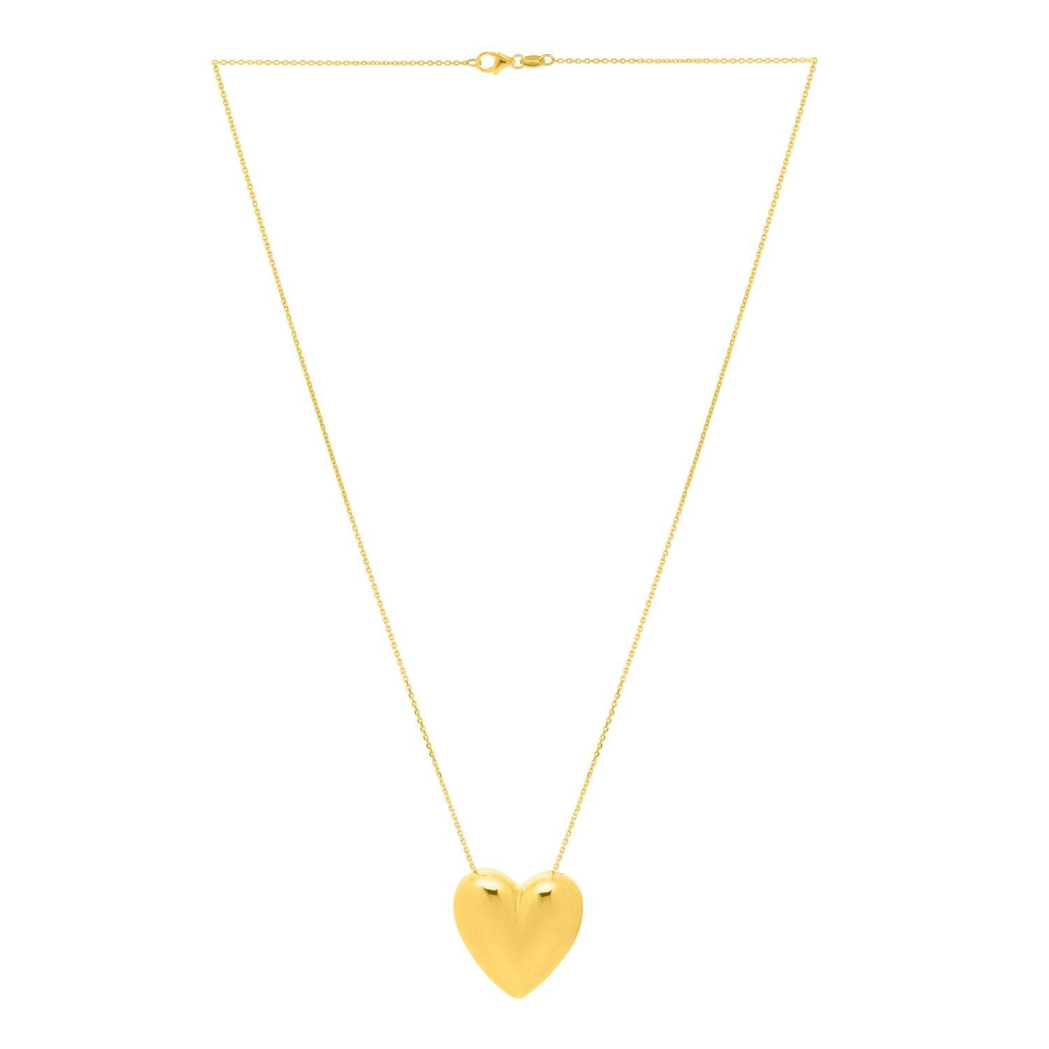 Designed to celebrate love and sentiment, this 14k yellow goldlarge puffed heart pendant features a soft, rounded shape and abrilliant finish. Gracefully suspended from an 18 inchesdiamond-cut link chain, it makes an exceptional gift or a treasuredaddition to any jewelry collection. Secured with a lobster claspclosure.