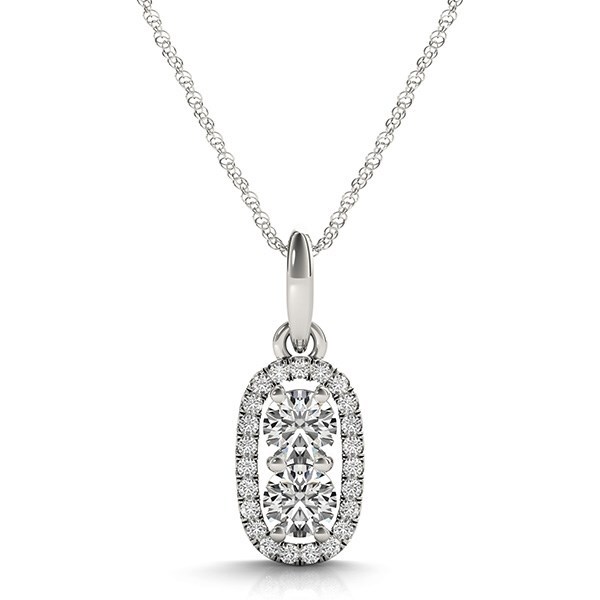 This two stone diamond pendant features a border of smallersparkling side diamonds. An alluring piece made of 14k whitegold.