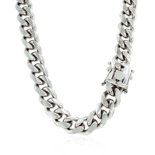 This rhodium-plated miami cuban chain comes in sterling silverand has a width of 8.40 millimeters.