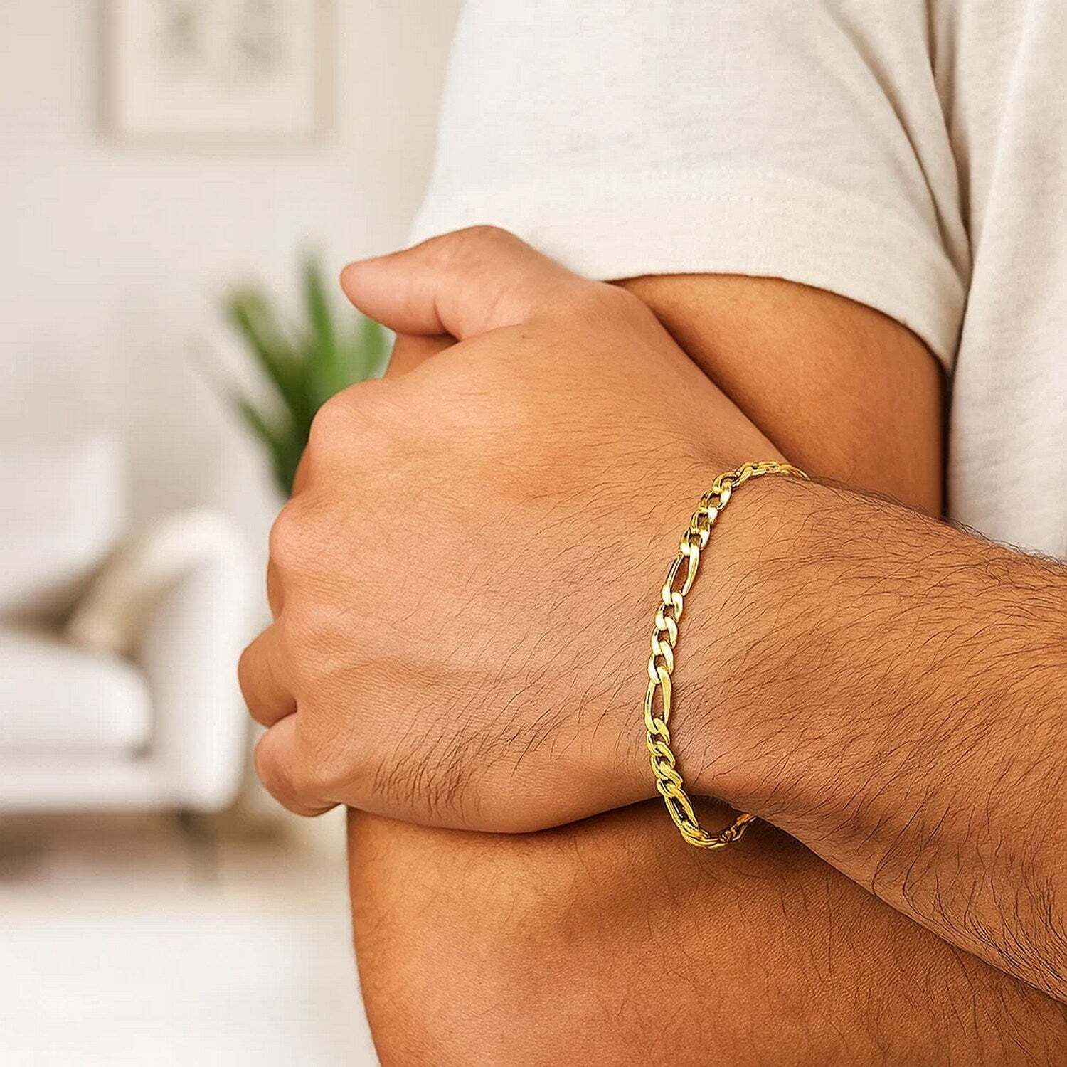 This link Figaro bracelet comes in 10k yellow gold and has awidth of 3.7 millimeters. Secured with a lobster clasp.