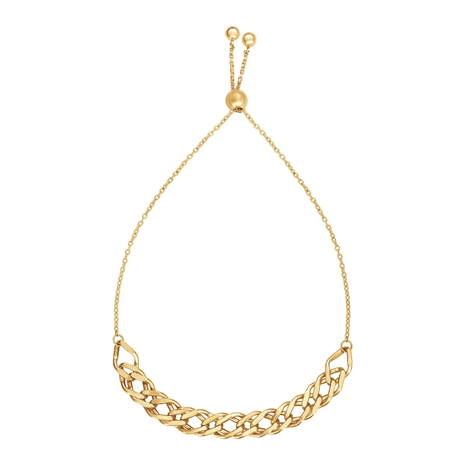 This adjustable gold bracelet features the contrasting shine oftwisted gold links. Bracelet is 9 1/4 inches long and adjusts witha drawstring clasp.